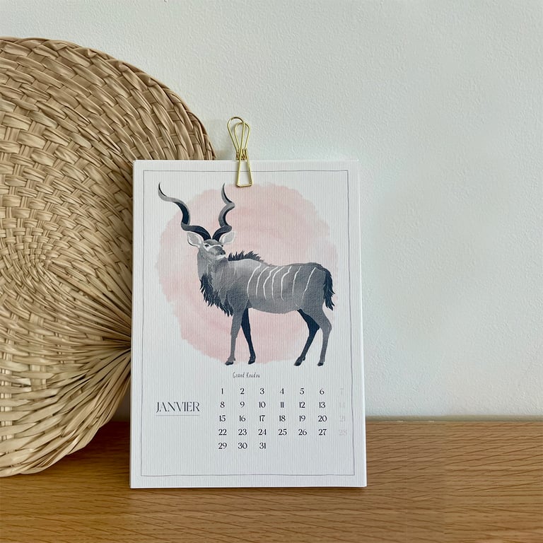 Calendrier représentant 12 animaux emblématiques de la Namibie.