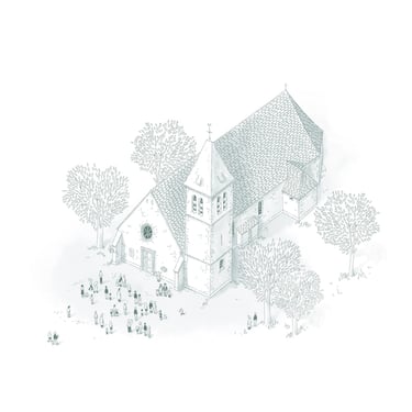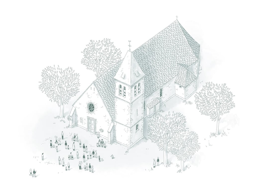 L’illustration représente l’église des Mesnuls ou a eu lieu l’événement autour de laquelle viennent se regrouper les invités. L’illustration a été dessinée dans des teintes de vert pour assorti au couleurs du baptême.