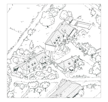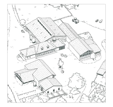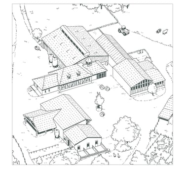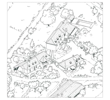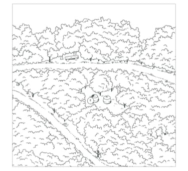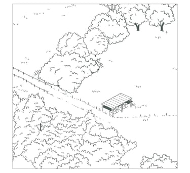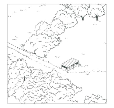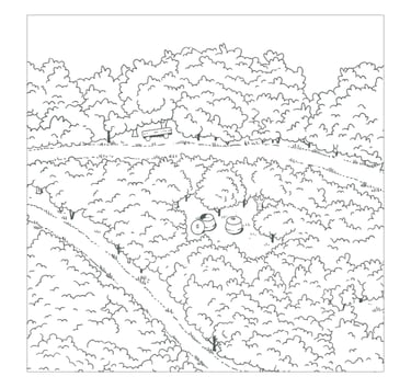 Cette illustration prolonge le travail réalisé pour les tables de lecture du Domaine de La Valette. Elle offre une vue d’ensemble du site, en rassemblant ses principaux éléments : sentiers, haies, ruches, bassin de nage, gîtes et espaces agricoles.