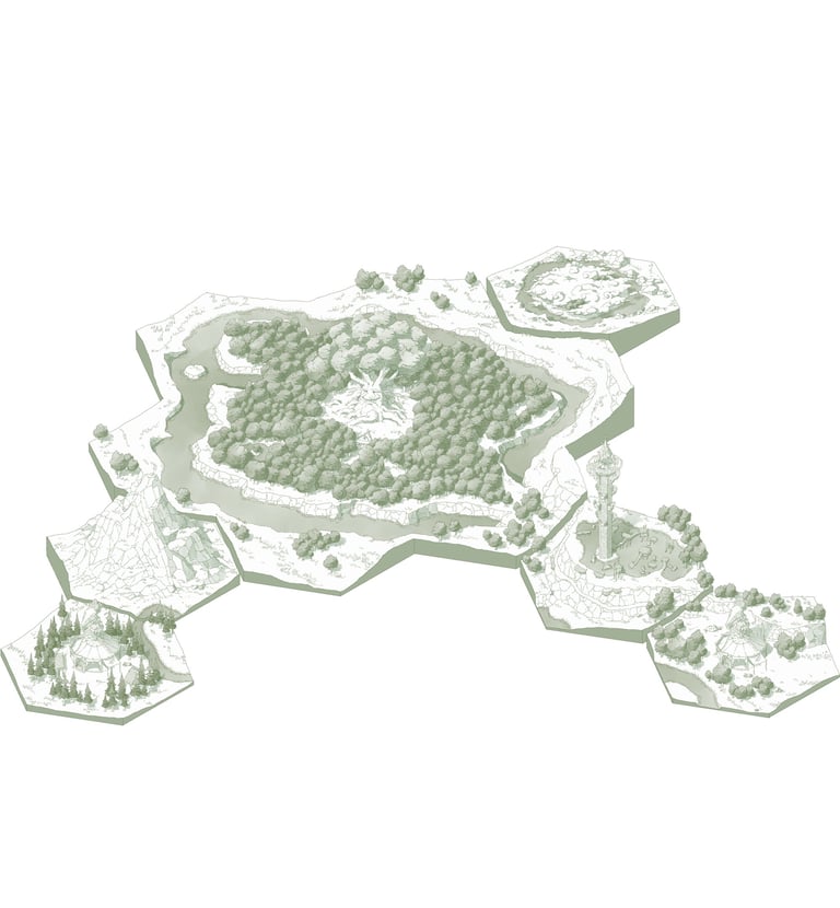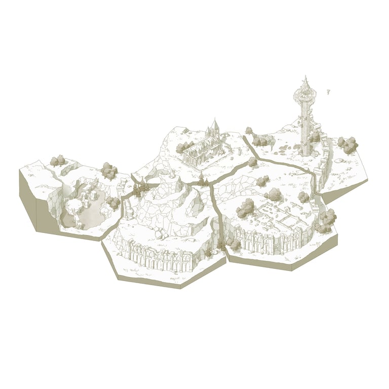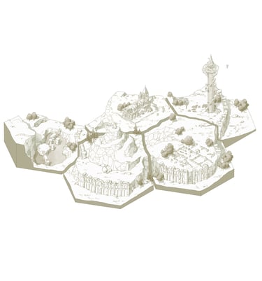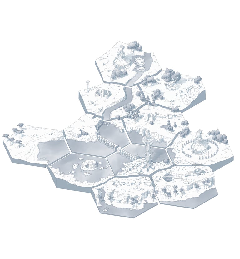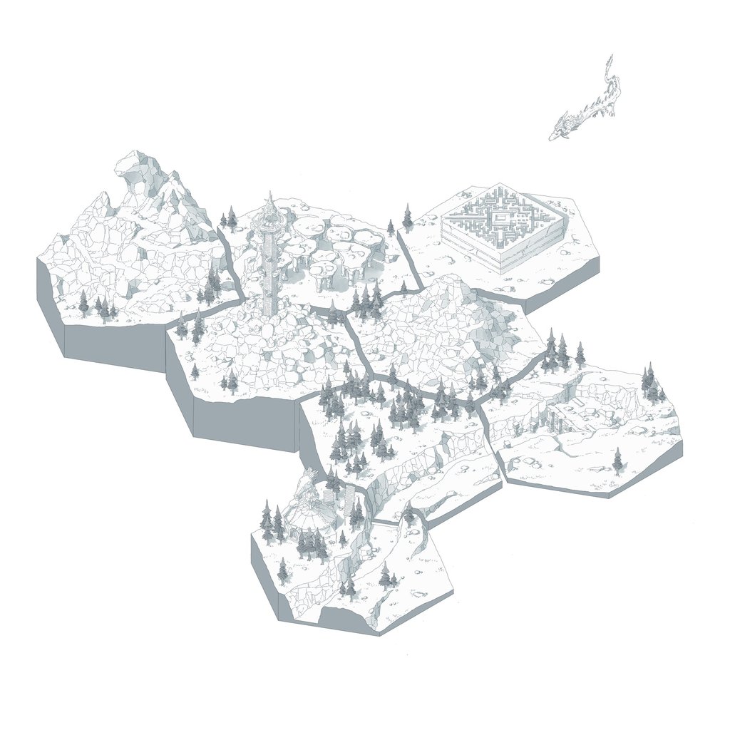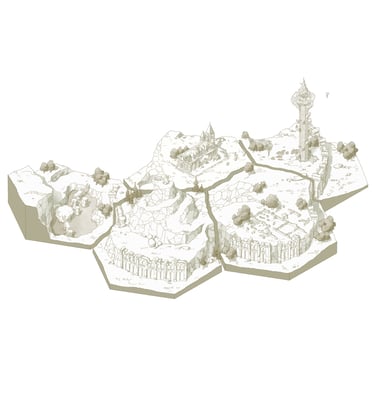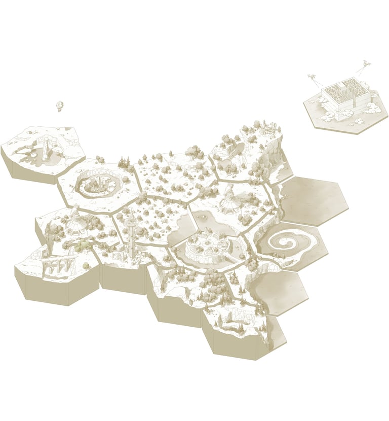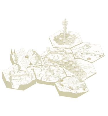 L’hexagone me donne la liberté de dessiner précisément les lieux en leur donnant une hiérarchie. Ainsi les éléments comme les villes ou les tours Cheikahs apparaissent plus importants et plus précis par rapport aux plaines ou aux forêts.