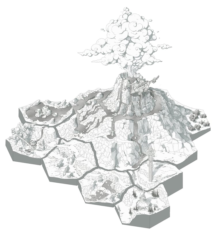 Dessin à la main des 15 régions d’Hyrule à travers 190 hexagones représentant les lieux emblématiques du jeu The Legend of Zelda - Breath of the Wild.