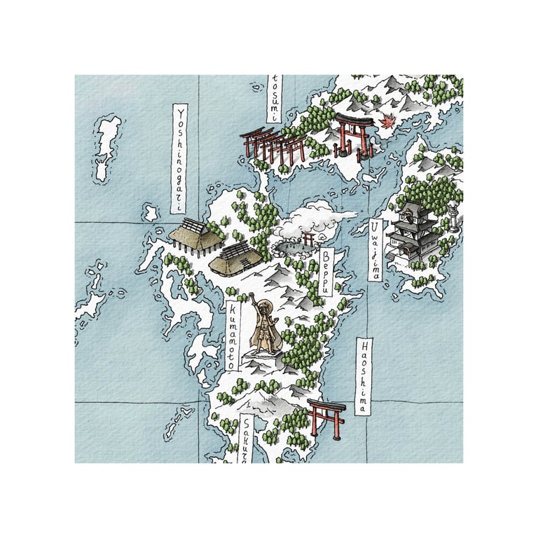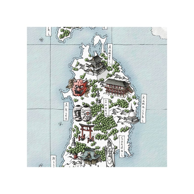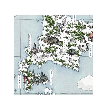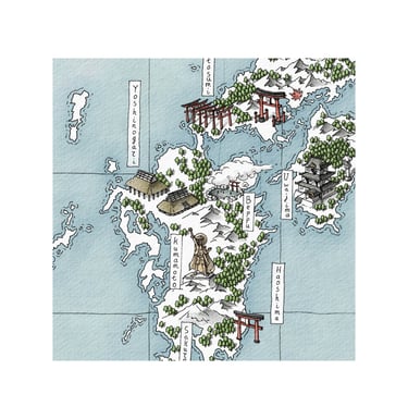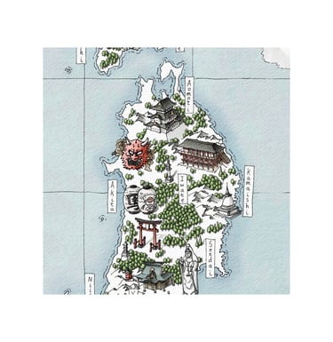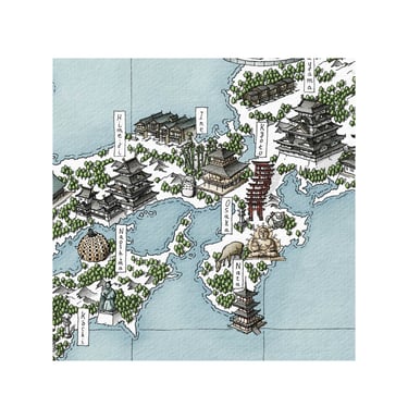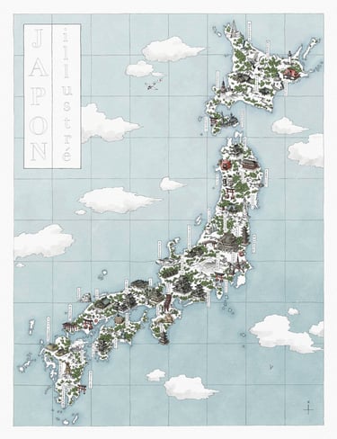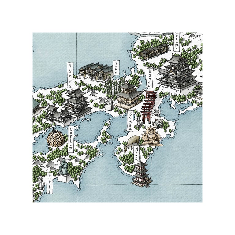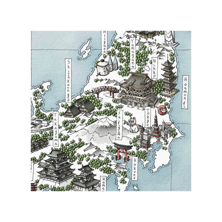 Dessin à la main à l'encre et à l'aquarelle mettant en évidence une sélection de lieux emblématiques visités lors de mon voyage au Japon en 2019.