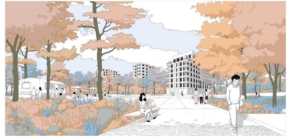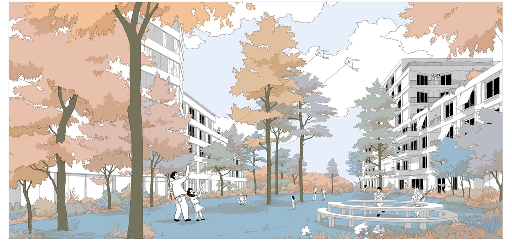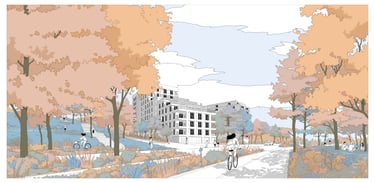 Nouvelle entrée de ville, le Village des Médias des JO de Paris 2024 est une opportunité pour Dugny de renforcer son identité en réinterprétant son héritage urbain. Inspiré des cités-jardins, le projet propose un équilibre entre densité et espaces ouverts, favorisant la lumière, les vues dégagées et une forte présence végétale à tous les niveaux : jardins privatifs, toitures vertes, potagers et façades végétalisées.